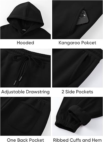 Design: Features a hoodie with a kangaroo pocket and matching jogger pants. The joggers have an adjustable drawstring waistband, two deep side pockets, and a back pocket for storing essentials like keys, phones, or wallet securely.