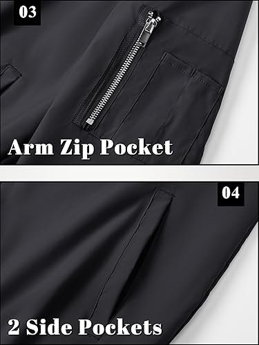 Lightweight polyester bomber jacket with full-zip stand collar and breathable windbreaker fabric. Features rib-knit cuffs, waistband, and collar for a comfortable fit, dual pen pockets on the sleeve, plus 1 zipper sleeve pocket, 2 slant hand pockets, and 1 inner pocket. Ideal for casual wear, sports, hiking, outdoor activities, and daily use in spring or fall.