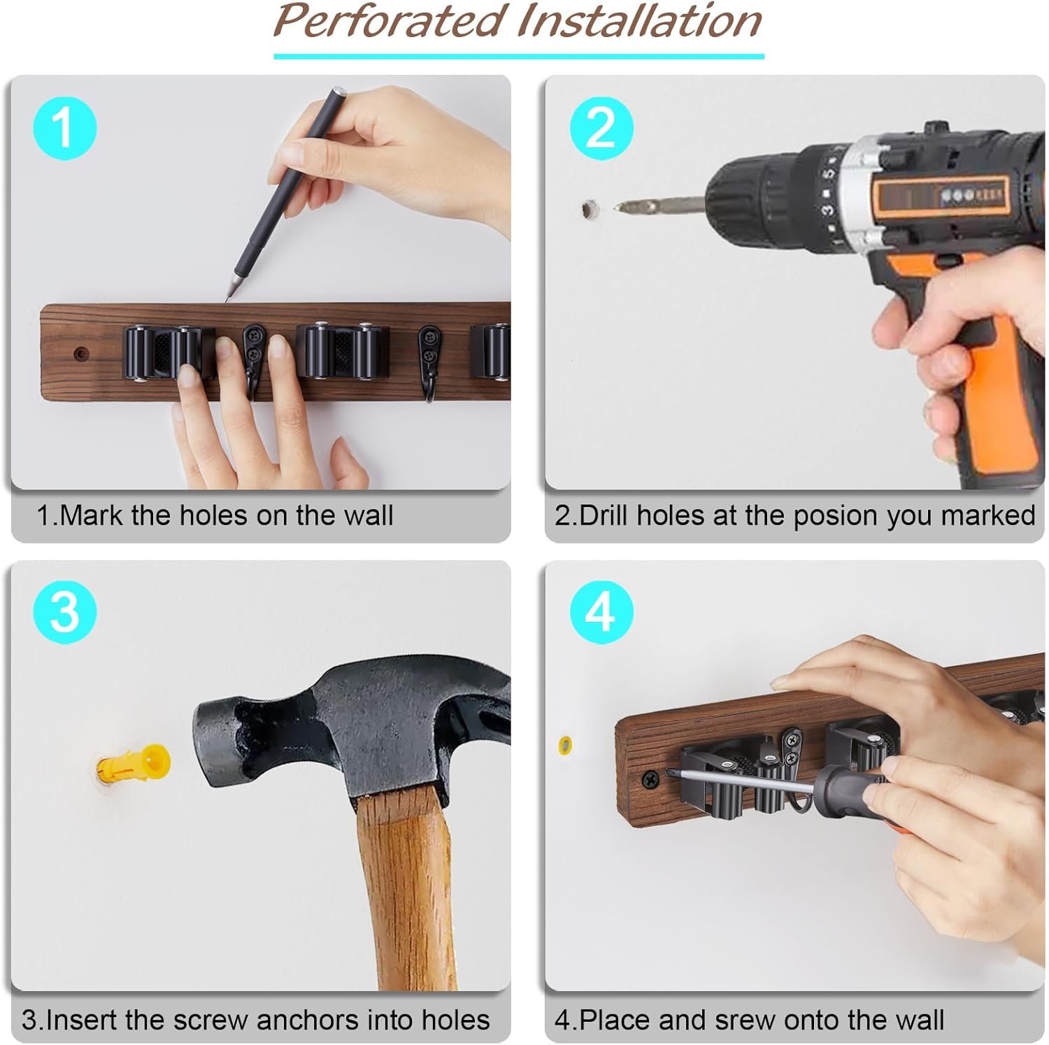 Multi-Functional Storage: Features 4 slots to securely hold mops, brooms, and other long-handled tools, plus 4 hooks for dustpans, gloves, or gardening accessories.
